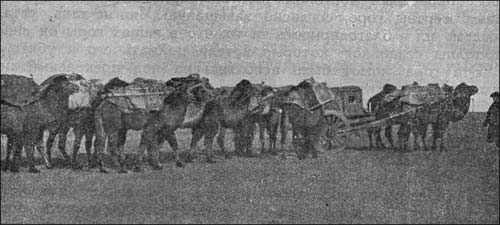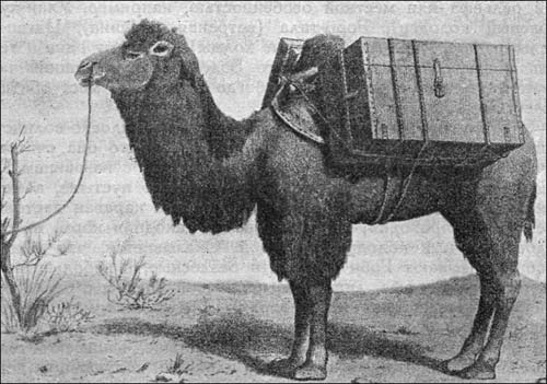 было больше корма для животных, поэтому обычно подальше от юрт. Воду всегда имели с собой в двух бочонках, а животных поили по дороге у колодцев утром и под вечер.Рис. 8. Верблюд, завьюченный походными ящиками