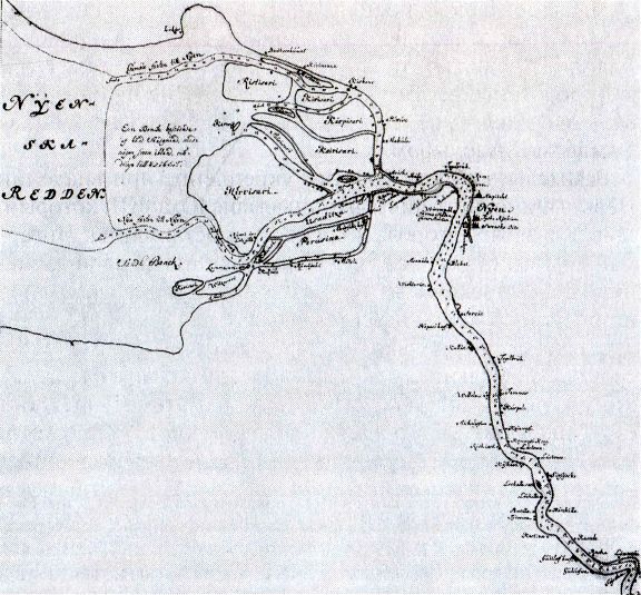 Летом 1701 г. обер-штурман Карл Эльдберг произвел замеры глубин в реке Неве, благодаря чему было составлено несколько гидрографических карт. На этой карте «ниенского рейда» (фарватера), где Нева впадает в Финский залив, отчетливо видны Ниен с укреплением, госпиталь и кирпичный завод, а также паромная пристань на другом берегу реки, где находился православный приход. На карте видны также три шведские усадьбы, или «резиденции», — на островах, которые теперь лежат в центральной части Петербурга: двор Коноу (Конау, Коноффа) на острове Усадица, двор Акерфельта на острове Перузина и двор Бьёркенхольма на острове Койвусаари (Березовом). Эрик Дальберг, посетив в 1681 г. эту низменную и подверженную наводнениям местность, описал ее так: «Река Нева на всем своем протяжении от Ладожского озера до Ниена по обе стороны имеет высокие песчаные берега, до самого города поросшие по большей части высоким лесом и кустарником. Она течет не особенно быстро и почти повсеместно имеет глубину шесть футов при низкой воде, так что при добром ветре можно идти против течения на лодьях и других судах, но при сильном встречном ветре затруднительно ходить и вниз, и вверх по течению. Но когда со стороны Балтийского моря, с запада или с северо- и юго-запада поднимается буря, вода в реке Неве у Ниена повышается на 4 локтя выше обычного уровня и причиняет большой ущерб стоящему там укреплению». Военный архив (Стокгольм)