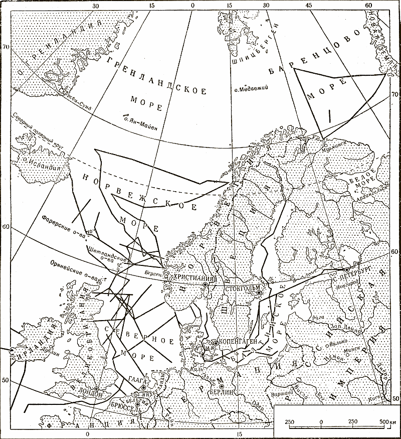 единой методики производства океанологических наблюдений. Так, в результате весьма тщательных исследований было окончательно установлено постоянство солевого состава океанических вод, т. е. постоянство относительного содержания главных солей, определяющих основные свойства морской воды. Это в свою очередь позволило определять соленость морских вод по удельному весу, определяемому ареометрами (физическим путем), и по содержанию хлора, определяемому химическим путем. Одновременно были разработаны «стандартные» горизонты, на которых всем судам, производящим океанологические исследования, рекомендовалось измерять температуры и с которых надо было брать образцы воды для дальнейших химических исследований. Кроме того, Международным советом были намечены линии (стандартные разрезы), по которым в определенные сроки (февраль, май, август, ноябрь) должны были производиться океанологические наблюдения. Такие линии были намечены в Атлантическом океане у берегов Англии и в морях Балтийском, Северном, Норвежском и Баренцовом. На долю России выпало производство наблюдений на стандартных разрезах в северной и восточной частях Балтийского моря и в Баренцовом море. Стандартные разрезы в Баренцовом море были намечены по следующему пути: от Кольского залива по Кольскому меридиану (33°30' в. д.) на север до 75° с. ш., затем на юго-восток к Гусиной Земле (Новая Земля) и оттуда к Кольскому заливу.Единообразие методов исследования, установленное Международным советом, позволило сравнивать наблюдения отдельных экспедиций. Установление сроков наблюдений дало возможность следить за сезонными колебаниями океанологических характеристик. Повторение наблюдений из года в год позволило улавливать вековые изменения этих характеристик.