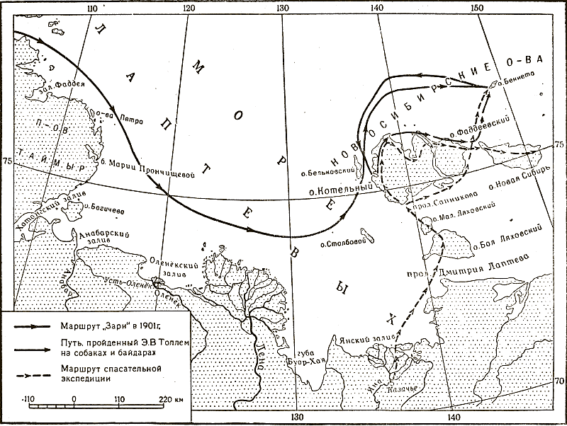 Плавание «Зари» (1901), маршруты Толля и спасательной экспедиции (1903).
