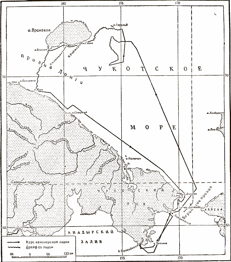 На востоке такой границей был установлен меридиан 168°49'30'' з. д., проходящий в Беринговом проливе между островами Ратманова и Крузенштерна и доходящий до самого Северного полюса. В том же 1926 г. на острове Врангеля был организован постоянный советский поселок. Первым начальником острова был назначен Георгий Алексеевич Ушаков, впоследствии прославившийся изучением Северной Земли. Люди и снаряжение были доставлены на остров Врангеля пароходом «Ставрополь» под командой Павла Георгиевича Миловзорова, который попутно поднял советский флаг на острове Геральд, отошедшем к Советскому Союзу по декрету 1926 года [412] .