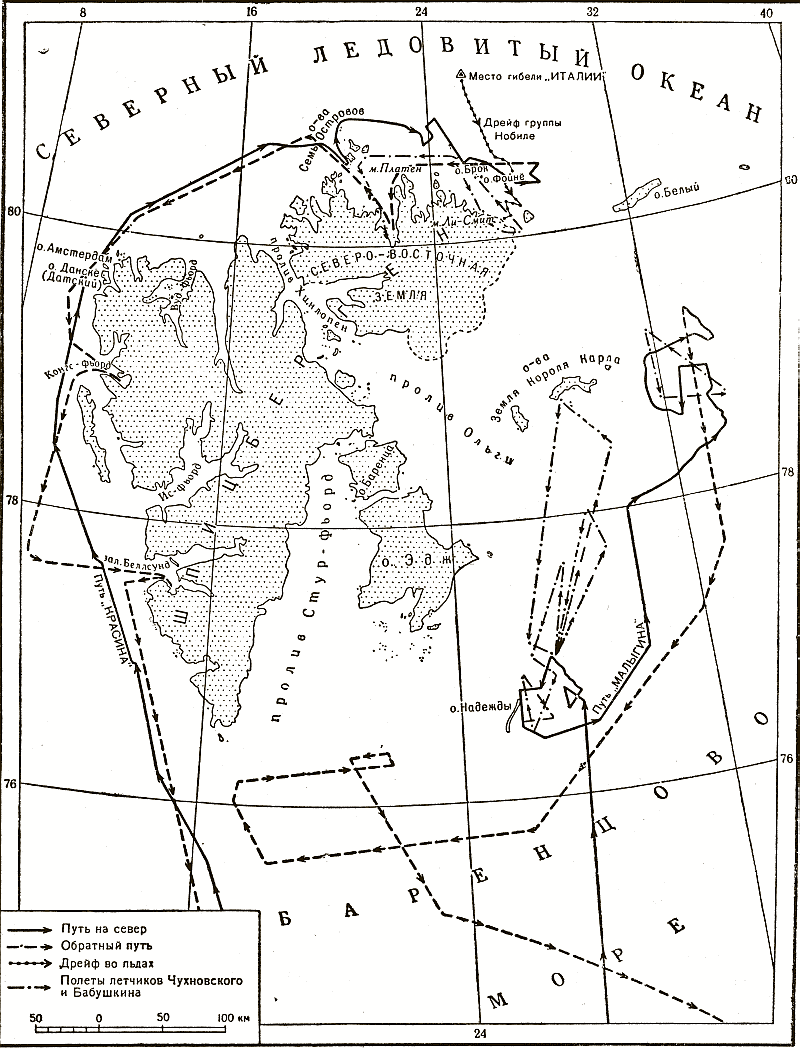 Маршруты советских экспедиций во время поисков участников экспедиции Нобиле (1928).