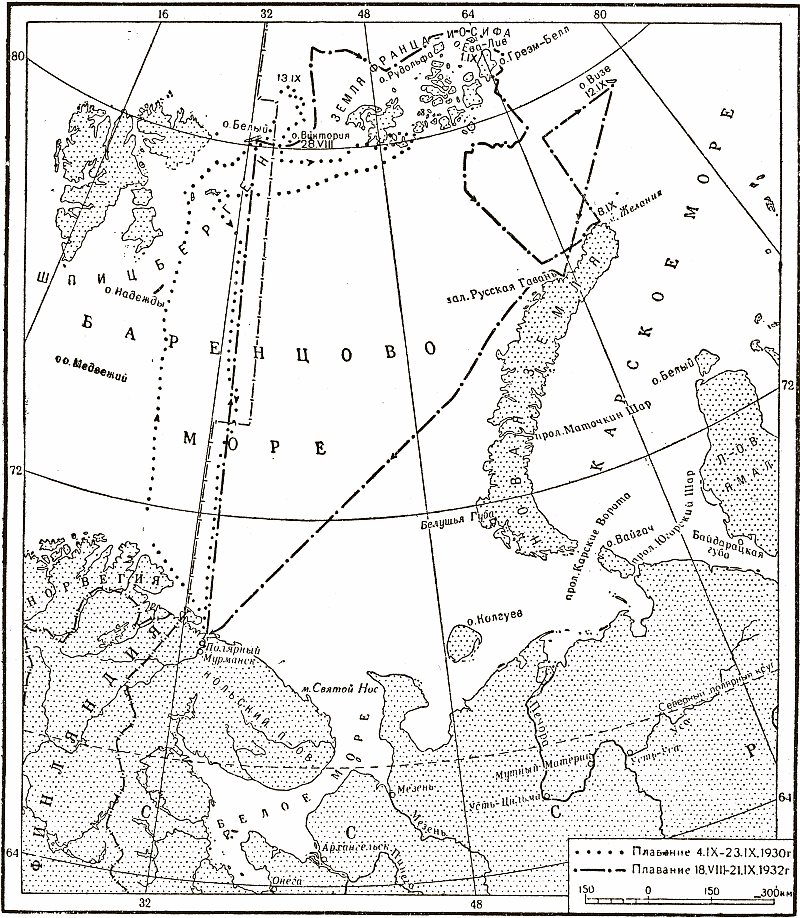 Огибание Земли Франца-Иосифа с севера все же представлялось возможным, температура Нордкапского течения в 1932 г. оставалась высокой. Кроме того, можно было предполагать, что максимум температуры, наблюдавшийся в 1930 г. на Кольском меридиане, в 1932 г. продвинется в район между Землей Франца-Иосифа и Северной Землей и уменьшит ледовитость этого района.
