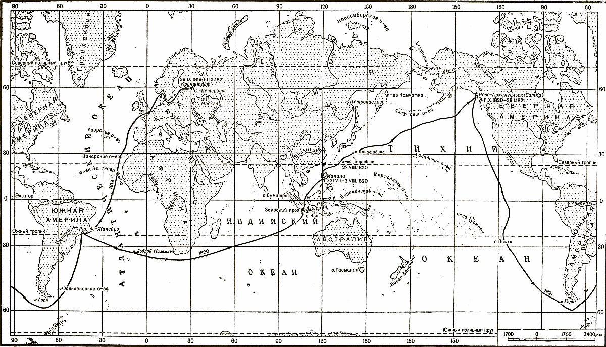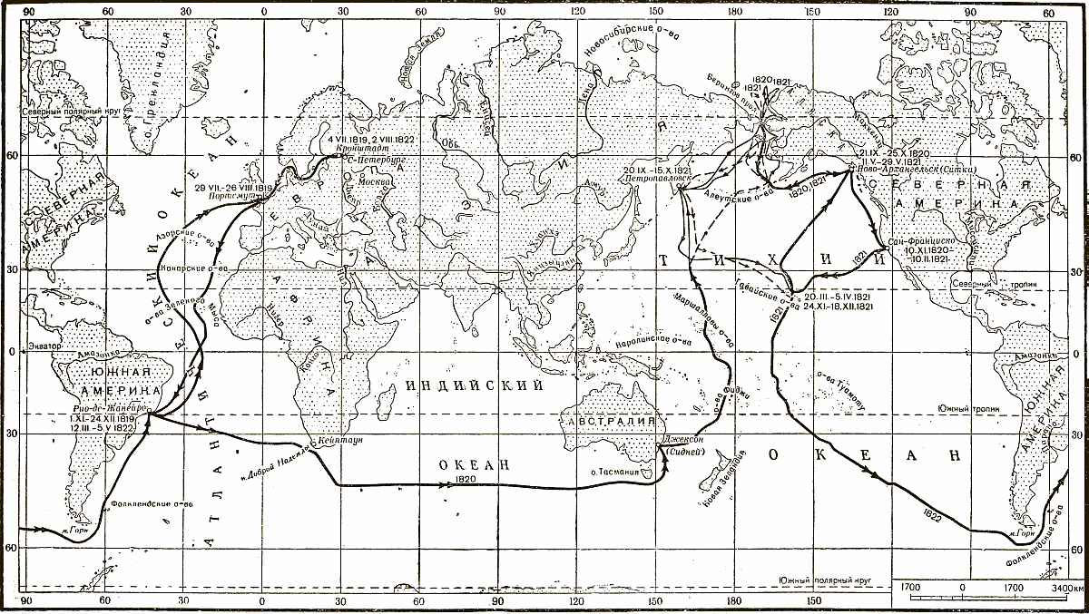 13 сентября 1821 г. суда вышли из Кронштадта, побывали по пути в Хельсингёре, прошли в Атлантический океан между Шетландскими и Оркнейскими островами и стали спускаться на юго-запад.