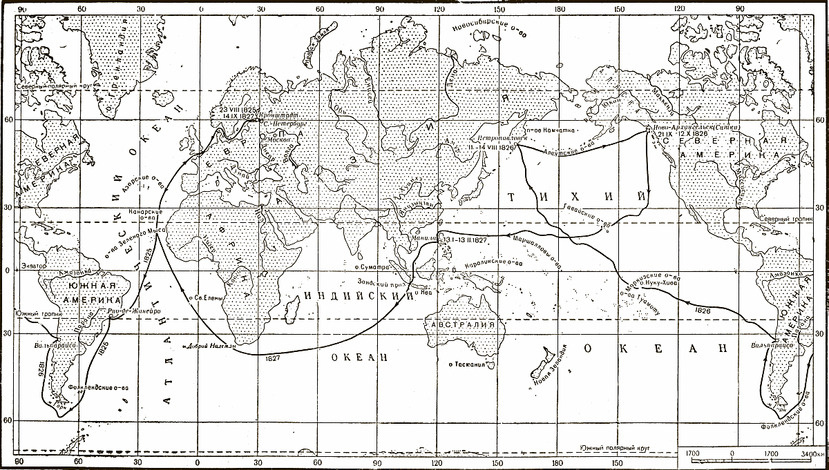 Покинув Таити 15 мая, шлюп «Моллер» направился к островам Лазарева, открытым в 1820 г. Беллинсгаузеном и Лазаревым, и определил их долготу. Пройдя между Гавайскими островами, он 18 июля 1827 г. пришел в Петропавловск. Летнее время 1827 и 1828 гг. Станюкович использовал для гидрографических работ в районе Русской Америки [257] . Зиму 1827/28 г. он посвятил исследованию района к востоку и северо-западу от Гавайских островов. Выйдя из Ново-Архангельска 21 октября 1827 г., Станюкович обследовал район к востоку от Гавайских островов с целью отыскания островов, якобы открытых испанцами и все еще значившихся на картах.