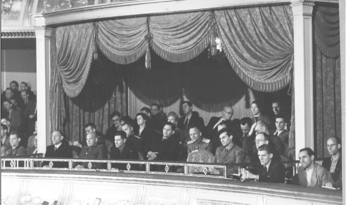 II Съезд СДПГ, сентябрь 1947. Правее пустого кресла сидит, склонив голову набок и сцепив пальцы рук на колене, М.А.Суслов. Рядом с ним, ближе к центру ложи – Н.А.Бубнов