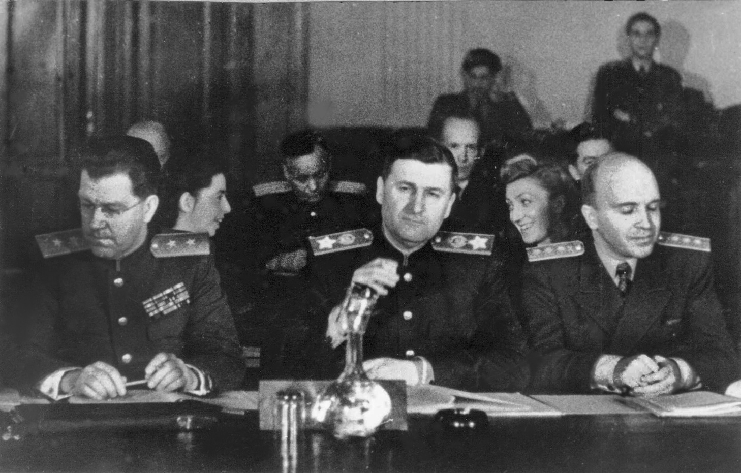 Заседание Контрольного Совета по Германии (11 февраля 1948). На переднем плане: М.И.Дратвин, В.Д.Соколовский, В.С.Семенов. На заднем плане – Н.А.Бубнов