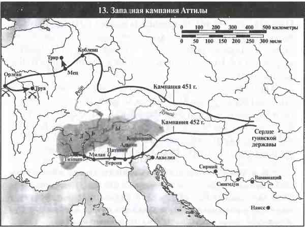 один из дошедших до наших дней источников не дает нам детального описания того похода, однако мы примерно знаем, что тогда произошло. Пройдя по течению Верхнего Дуная на северо-запад от Большой Венгерской равнины, орда переправилась через Рейн в районе Кобленца и двинулась дальше на запад (карта № 13). Согласно некоторым, по общему мнению, весьма сомнительным источникам, Мец пал 7 апреля, а вскоре его участь разделила и древняя имперская метрополия, Трир. Затем полчища Аттилы вторглись в самое сердце римской Галлии. К июню они дошли до Орлеана, где дислоцировалась крупная группировка аланов, находившихся на римской службе. Город был подвергнут планомерной осаде; имеются смутные указания на то, что Аттила рассчитывал привлечь на свою сторону Сангибана, предводителя части аланов, находившихся в городе (Iord. Getica. 195). В то же самое время, согласно другому весьма сомнительному источнику, некоторые отряды из войска Аттилы достигли даже ворот Парижа, где они были обращены вспять благодаря чудесному заступничеству покровительницы города, св. Женевьевы. Создается впечатление, что войско гуннов прошло всю римскую Галлию вдоль и поперек, грабя и опустошая все на своем пути.Аэций все еще оставался верховным главнокомандующим войсками римского Запада, и, насколько нам известно из второго панегирика Меробавда, он предвидел вероятность гуннского вторжения на Запад по крайней мере с 443 г. Когда же это наконец произошло спустя почти 10 лет, он начал действовать. Перед лицом беспрецедентной угрозы Аэций стремился сколотить такую коалицию, у которой был бы шанс на успех. Раннее лето 451 г. застало его в походе на север через всю Галлию во главе соединений римской армии, дислоцированных в Италии и Галлии, а также отрядов, выставленных многочисленными союзными племенными объединениями, такими как бургунды и вестготы короля Теодориха из Аквитании. Приближение этой весьма пестрой по своему составу группировки вынудило Аттилу уйти 14 июня от стен Орлеана. В конце того же месяца отряды Аэция настигли отступавшую орду где-то в районе Труа, т. е. примерно в 150 километрах к востоку.