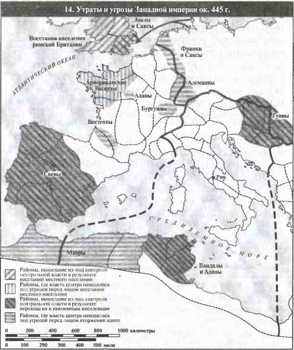 никак не датирует этот мятеж — впрочем, он вообще не дает точных датировок, — однако два хрониста, писавших в Галлии, чья осведомленность о событиях в Британии говорит о продолжавшихся сношениях через пролив, что, в свою очередь, засвидетельствовано в «Житии св. Германа», отмечают, что положение на том пространстве, которое осталось от римской Британии, стало поистине угрожающим где-то около 440 г. Оказавшись перед лицом постоянно ухудшавшейся ситуации, жители римской Британии в последний раз обратились с просьбой вновь принять их под крыло империи (официальное послание было адресовано Аэцию). Датировка этого обращения остается спорной, однако Гильдас дает понять, что Аэций на тот момент был «трехкратным консулом». В третий раз Аэций стал консулом в 446 г., поэтому, если считать указание Гил ьдаса достоверным, послание дошло до адресата в то самое время, когда тот с тревогой смотрел в сторону Дуная, пытаясь разглядеть первые признаки надвигавшейся гуннской угрозы. Даже если Гильдас ошибся, тем не менее примерную дату можно считать установленной. Аэцию пришлось иметь дело с чересчур многими угрозами в других местах, чтобы быть в состоянии ответить на последний отчаянный призыв римской Британии {371} .Картина вышла мрачная. К 452 г. Западная Римская империя потеряла существенную часть своих провинций (см. карту № 14): всю Британию, большую часть Испании, богатейшие провинции Северной Африки, те области Юго-Западной Галлии, которые пришлось уступить вестготам, а также Юго-Восточную Галлию, отданную бургундам. Кроме того, большая часть из оставшихся территорий пережила серьезные потрясения за последнее десятилетие или около того, и доходы с этих земель также должны были весьма существенно сократиться {372} . Проблема сокращения финансовых ресурсов стала непреодолимой. Косвенная роль гуннов в этом процессе истощения, выразившаяся в том, что они изначально вынудили толпы вооруженных переселенцев двинуться через границу, нанесла гораздо больший вред, нежели какой бы то ни было прямой ущерб, причиненный Аттилой.