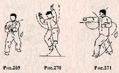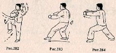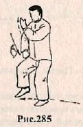Правую руку опустите вниз, вращая её вдоль продольной оси против часовой стрелки, а левую – поднимите вверх перед грудью, при этом необходимо разжать кулак. Одновременно вес тела перенесите на левую ноту, а правой ногой – сделайте шаг вперёд и примите стойку «дулибу».Движение выполняется сначала на фазе вдоха, затем -выдоха (рис. 285).