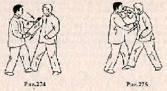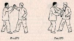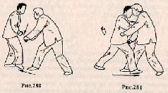 Применение. Противник делает шаг правой ногой вперед и пытается захватить вас за одежду на груди. Сделайте шаг левой ногой назад, принимая стойку «дулибу» и сбейте руки противника вниз, нейтрализуя попытку захвата (рис. 280). Моментально сделайте длинный шаг правой ногой вперед и контратакуйте, нанося прямой удар двумя кулаками одновременно в солнечное сплетение и грудь (рис. 281).
