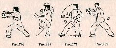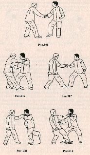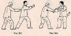 небольшой шаг назад, принимая стойку «дулибу». В процессе поворота руки переместите в горизонтальной плоскости но дуге вперёд и затем назад, располагая кулаки перед животом так, чтобы правый находился над левым. Сделайте вдох (рис. 301). Теперь сделайте шаг правой ногой вперёд, поворачивая корпус налево, и выпрямите правую руку в локте, нанося удар предплечьем. Одновременно левую руку отведите назад, располагая кулак возле поясницы. Сделайте выдох (рис. 302).Применение. Если второй противник делает шаг правой ногой вперёд и атакует, нанося прямой удар правым кулаком в позвоночник (рис. 303), необходимо быстро повернуться направо и нейтрализовать атаку, выполняя блок правым предплечьем изнутри наружу (рис. 304). Если противник попытается захватить вашу правую руку за запястье (рис.305), сделайте шаг правой ногой вперёд и поднимите его правую руку вверх левой рукой. Одновременно контратакуйте, нанося правой рукой прямой удар кулаком в нижнюю часть груди (рис. 306). Если противник сделает шаг правой ногой назад, уходя из зоны поражения, и заблокирует ваш удар, используя левую ладонь (рис. 307), следует поднять его левую руку вверх своей левой рукой (рис. 308) и, делая шаг левой ногой вперёд, нанести удар правым кулаком в солнечное сплетение, при этом надо продолжать контролировать левую руку противника (рис. 309).
