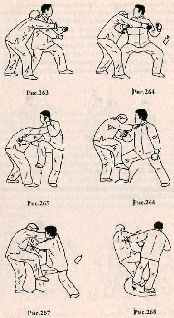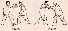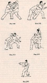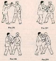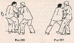 Применение. Противник делает шаг правой ногой вперёд и атакует, нанося прямой удар правым кулаком в голову. Левой ногой сделайте шаг влево – вперёд и выполните блок внешней стороной левого предплечья изнутри наружу, нейтрализуя атаку (рис. 286). Противник убирает вашу левую руку вниз, надавливая на неё сверху вниз обеими ладонями, при атом он делает шаг правой ногой назад (рис. 287). Быстро сделайте шаг правой ногой вперёд, поворачиваясь направо и опуская правую руку вниз (рис. 288). Опустив правую ногу на землю, нанесите правым плечом удар в грудь противника (рис. 289).
