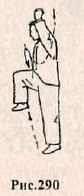 Продолжая удерживать вес тела на левой ноге, поднимите правую ногу вверх. Корпус немного поверните направо, при этом левую руку поднимите вверх над годовой, сжав кисть в кулак. Одновременно правую руку поднимите вверх, а затем сразу же опустите вниз, располагая её возле правого бедра. Сделайте вдох (рис. 290).