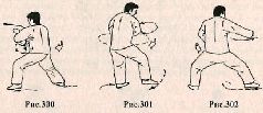 Правой ногой сделайте небольшой шаг вперёд, подшагивая к левой. Левую руку к туловищу, а правую – по дугообразной траектории переместите вниз и расположите кулак перед животом над левым коленом. Одновременно левой ногой сделайте шаг вперёд. Движение выполняется сначала на фазе вдоха, а затем выдоха (рис. 300), Центр тяжести полностью сместите на левую ногу и повернитесь направо на 1800. Левой ногой сделайте
