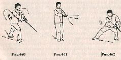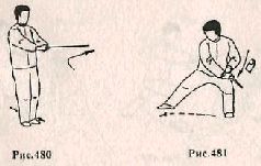 Вес тела сместите на правую ногу, продолжая поворот направо. Руки разведите в стороны на уровне плеч, при этом остриё меча направлено вперёд (рис. 514), Центр тяжести полностью перенесите на правую ногу, а левую – поднимите вверх, согнув в коленном суставе. Руки соедините перед животом. Остриё меча направлено вперёд (рис 515). Опустите левую ногу на землю, делая шаг вперёд, причём стопа касается поверхности пяткой (рис. 516). Центр тяжести сместите палевую ногу а правую – подтяните клевой, располагая их рядом. Одновременно нанесите колющий улар мечом вперёд (рис, 517).