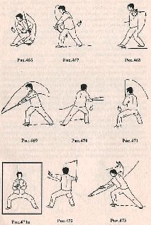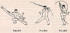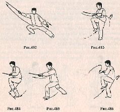 Центр тяжести перенесите на правую ногу, принимая стойку «мабу», при этом корпус поверните направо. Руки выполняют дугообразное движение, перемещая меч вправо – вниз и затем вверх. В конечном положении остриё меча направлено вниз (рис. 495). Корпус поверните немного направо, смещая центр тяжести на левую ногу, а правую-поднимите вверх, согнув в коленном суставе. Руки согните в локтях, опуская вниз и располагая кисти на уровне живота. Остриё меча направлено вправо – вперёд – вверх (рис. 496). Левой ногой сделайте небольшой прыжок вперёд, сохраняя стойку на одной ноге (рис 497). Правую ногу опустите на землю, делая шаг вправо -вперёд и примите стойку «гунбу». Выпрямляя руки в локтевых суставах, нанесите колющий удар мечом вперёд – вверх (рис 498). Теперь корпус поверните налево, сгибая руки и опуская их немного вниз. Переместите меч влево – вниз, вращая кисти против часовой стрелки (рис. 499). Вес тела быстро перенесите на левую ногу и, выпрямляя руки, нанесите колющий удар вперёд – вниз (рис.500).