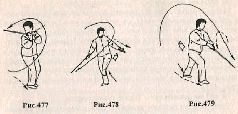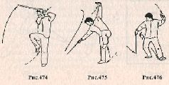 Не меняя стойку, отклоните голову и туловище назад. Вращая правую кисть против часовой стрелки, переместите меч по дуге влево -вверх, располагая его в конечном положении над головой так, чтобы остриё было направлено назад и вверх. Одновременно левую руку отведите в сторону (рис. 490). Корпус наклоните вперёд и, продолжая вращение кистью, нанесите рубящий удар мечом (рис. 491).