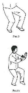 3. «Цзо цзопань». В этой стоике стопы расположены почти параллельно на расстоянии равном ширине плеч. Ноги перекрещены и сильно согнуты в коленном суставе. В правосторонней стойке левая нога касается поверхности земли кончиками пальцев, при этом вес тела смещен на правую ногу в пропорции 80:20 (рис. 6,а).