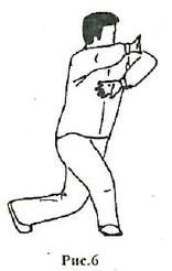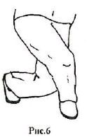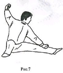 4. «Пубу». В этой стойке стопы расположены перпендикулярно друг другу па расстоянии равном ддине нот. Одна нога максимально согнута в коленном суставе, в то время как другая полностью выпрямлена. В левосторонней стоике вес тела смещен на правую ногу почти на 100 процентов. При этом левая нога опирается о поверхность земли пяткой (рис. 7).