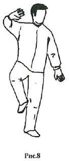 5. «Дулибу». Это стойка на одной ноге. Опорная нога чуть согнута в коленном суставе. Вторая нога достаточно сильно согнута в колене и поднята вверх, при этом стопа располагается на уровне коленного сустава опорной ноги. Носок-стопы, поднятой вверх ноги, направлен внутрь (рис. 8).