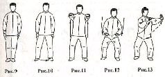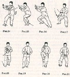 Делая вдох, корпус поверните немного влево. Одновременно обе руки поднимите по дугообразной траектории вверх, располагая кисти рук на уровне подбородка (рис. 13). Поверните корпус вправо на 90", смещая вес тела на левую ногу. Одновременно разверните носок правой ноги вправо и переместите обе руки вдоль туловища в эту же сторону. При этом левая рука вращается вдоль продольной оси против часовой стрелки, а правая рука – но часовой стрелке, взгляд направлен влево – вперёд. Сделайте выдох (рис. 14). Переместите вес тела на правую ногу и согните её в коленном суставе. Делая вдох, левую ногу поднимите вверх, а корпус поверните немного вправо (рис. 15). Теперь переместите левую ногу скользящим движением влево – вперёд и опустите ее на землю, при этом руки остаются в прежнем положении. Сделайте выдох (рис. 16) Переместите центр тяжести на правую ногу и поверните корпус на 45* влево. Обе руки переместите по дугообразной траектории вперед – вниз. Взгляд направлен вперёд. Движение выполняется на фазе выдоха (рис. 17). Правую руку переместите вперёд – вверх на уровень груди, при этом левую руку поднимите немного вверх, сделав полукруг. Вес тела перенесите на левую ногу, а правой – слелайте шаг вперёд, при нём стопа касается земли только носком. Сделайте вдох (рис. 18). Левую руку немного опустите вниз и поверните её вдоль продольной оси. ладонью вверх. Правую руку сожмите в кулак и, делая выдох, опустите на левую ладонь. Взгляд направлен вперёд (рис, 19). Перенесите вес тела на левую ногу, а правую поднимите вверх, согнув в коленном суставе. Одновременно поднимите правую руку па уровень подбородка. Сделайте вдох (рис. 20). Правую ногу резко опустите на землю. Одновременно нанесите удар внешней стороной правого кулака по внутренней части левой ладони. Движение выполняется на фазе выдоха (рис, 21).