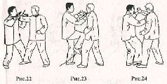 2) В случае если противник сделал шаг правой ногой назад, захватите левой рукой его правую руку и потяните влево от себя. Одновременно контратакуйте, нанося левым кулаком восходящий удар в подбородок, а правым коленом – восходящий удар в пах (рис. 23). Пытаясь уйти от контратаки, противник, возможно, повернётся направо. В этом случае следует нанести удар носком стопы по берцовой кости его левой ноги (рис.24).