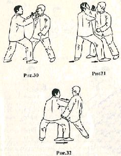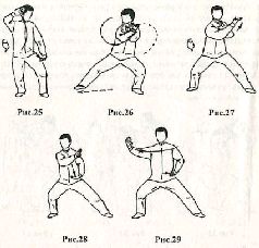 при этом ладонь правой руки направлена вверх. Одновременно с движением рук перенесите центр тяжести на левую ногу, а правой сделайте шаг вправо. Взгляд направлен вправо – вперёд. Движение выполняется на фазе выдоха (рис. 26). Поворачиваясь направо, переместите вес тела на правую ногу. Правую руку поднимите немного вверх и сделайте вдох (рис. 27). Правую руку поверните вдоль продольной оси против часовой стрелки, и левую руку опустите вниз до уровня поясницы и расположите перед животом. Движение выполняется на фазе выдоха (рис. 28). Поверните корпус направо и, делая выдох, переместите правую руку вправо. При этом пальцы правой кисти должны быть направлены вверх. Левую ладонь уприте в левый бок. Завершите выдох (рис. 29).Применение. Противник, делая шаг правой ногой вперёд, атакует прямым ударом правым кулаком в голову. Сделайте правой ногой шаг влево – вперёд, ставя её рядом с правой ногой противника. Одновременно правой рукой отведите его атакующую руку вправо от себя, а левой рукой контролируйте плечо правой руки противника (рис. 30). Теперь надавите на руку противника своей правой рукой и сделайте шаг правой ногой вперёд, ставя её между его ног. Правым плечом упритесь в подмышку противника (рис. 31). Если противник сделает шаг назад, быстро подшагннте правой ногой к его левой ноге, блокируя ее, и контратакуйте, нанося удар локтём в область плавающих рёбер (рис. 32).