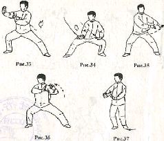 Корпус поверните направо, поднимая левую руку вверх. Центр тяжести сместите ещё немного на правую ногу. Сделайте вдох (рис.33).Теперь поверните корпус влево, смещая вес тела на левую ногу. Обе руки опустите вниз по дугообразной траектории и сделайте выдох (рис. 34), Продолжая поворачивать корпус влево, начните поднимать обе руки влево – вверх, при этом центр тяжести смешается на правую ногу. Движение выполняется на фазе вдоха (рис. 35). Продолжая смещать вес тела на правую ногу, подведите руки к груди и поверните туловище ещё немного вправо. Продолжайте делать вдох (рис.36). Опустите руки вниз, выполняя давящее движение вперёд. Левую ногу подтяните к правой, причем стопа касается поверхности земли кончиками пальцев. Сделайте выдох (рис. 37).