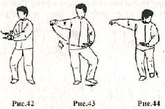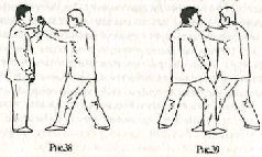 Применение. Противник делает шаг левой ногой вперёд и пытается захватить вас левой рукой за грудь. Захватите руку противника за запястье своей левой рукой (рис, 38) и быстро сделайте шаг правой ногой вперёд, ставя её рядом с его правой ногой (рис. 39). Не останавливаясь, контратакуйте правым локтём снизу вверх по левому плечу противника (рис. 40). а затем моментально нанесите ещё один удар обеими ладонями в область плавающих рёбер (рис.41)