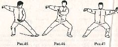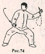 Центр тяжести немного сместите на правую ногу. Правую кисть сожмите в кулак и опустите вниз к пояснице, одновременно левую кисть, сжатую в кулак, поднимите „верх по дугообразной траектории. Движение выполняется сначала в фазе вдоха, а затем выдоха. (Рис.74)