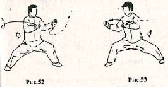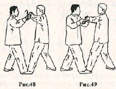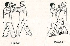 Применение. Противник делает шаг левой ногой вперёд и пытается захватить вас за грудь. Сделайте шаг правой ногой навстречу противнику, ставя её рядом с его левой стопой. Одновременно захватите левую кисть противника своей правой рукой и выкрутите её наружу (рис.48). Левой рукой захватите левую кисть противника возле запястья (рис. 49). Если противник попытается нанести удар правой рукой, выполните блокирующее движение левой рукой (рис. 50) и моментально сделайте шаг левой ногой влево – вперёд, одновременно выкручивая руку противника ещё сильнее наружу. При этом левой рукой толкайте правую руку противника влево – вперёд (рис. 51).
