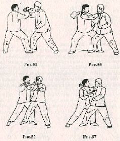 Применение. Противник делает шаг правой ногой вперёд, сокращает дистанцию и атакует, нанося прямой удар правым кулаком в голову. Нейтрализуйте атаку противника, выполняя горизонтальный блок правым предплечьем снаружи внутрь (рис. 54). Быстро сделайте шаг левой ногой вперёд, ставя её за правой ногой противника и поворачиваясь направо. Правой рукой надавите на правую руку противника сверху вниз, продолжая сё контролировать. Одновременно контратакуйте, нанося левым локтем улар в грудь, а кулаком в подбородок (рис. 55). Продолжая атаку, вы можете толкнуть противника в грудь левым предплечьем и перебросить его через левую ногу (рис. 56), или нанести ещё один удар, но уже правым кулаком в солнечное сплетение (рис. 57).
