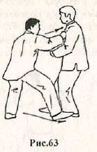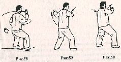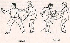 Применение. Если противник атакует сзади, одновременно нанося удар правым кулаком и ногой (рис. 61), необходимо моментально развернуться на 180° влево, подпрыгивая вверх (рис. 62), Опустившись на землю, контратакуйте правым кулаком в грудь (рис. 63).