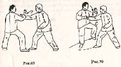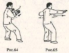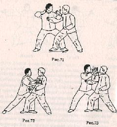 на землю, нанесите нисходящий удар левым локтем по правой руке противника (рис. 71). Продолжая контратаку нанесите прямой удар правым кулаком в грудь, при этом продолжайте контролировать правую руку противника, надавливая левой рукой на неё сверху вниз (рис. 72). Также завершить контратаку можно, нанося удар внешней стороной левой кисти в голову противника, одновременно ударяя правым локтём по его правой руке сверху вниз (рис. 73).9.«Ша яо я чжоу цюань» – Атаковать почки, нажимая локтем и кулаком