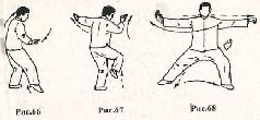 Разожмите оба кулака и скрестите руки перед грудью, при этом правая располагается над левой так, чтобы пальцы правой ладони были направлены вверх, а левой – вперед. Сделайте вдох (рис. 64). Не меняя стойку, разведите руки в стороны и сделайте выдох (рис. 65). Далее сместите вес тела на левую ногу, при этом правую пятку необходимо приподнять вверх, и, делая выдох, опустите правую руку вправо – вниз. Одновременно левую руку немного поднимите вверх (рис.66). Теперь правую ногу и руку поднимите вверх, а левую руку, выпрямляя в локтевом суставе, отведите влево. Сделайте вдох (рис. 67). Опустите правую ногу на землю и, поворачиваясь направо, сделайте шаг левой ногой вперёд. Перенесите центр тяжести на левую ногу; принимая стойку «гунбу». Правую руку переместите вправо на уровне груди. Одновременно левую руку с кистью в форме «гоу» переместите влево – вперёд. Движение выполняется на фазе выдоха (рис. 68).