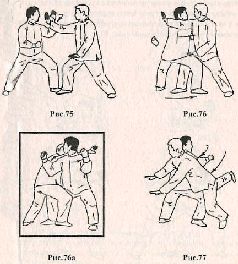 Применение. Противник делает шаг правой погон вперёд, сокращает дистанцию и атакует, нанося прямой удар открытой правой ладонью в подбородок. Нейтрализуйте атаку противника, выполняя блок левым предплечьем снаружи внутрь и одновременно делая шаг левой ногой влево – вперед (рис. 75). Не останавливаясь, сделайте шаг правой ногой вперёд и нанесите удар правым локтем в среднюю часть туловища (область правой почки) (рис. 76,76а). Завершите контратаку, поворачивая туловище направо и продолжая давить правым локтем в область плавающих рёбер противника. Воздействуя, таким образом, на противника, вы можете легко опрокинуть его на землю (рис. 77).