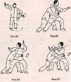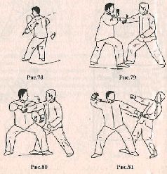 Применение. Противник делает шаг правой ногой вперёд, сокращая дистанцию и пытается захватить вас за одежду на груди. Сделайте шаг правой ногой вперёд навстречу противнику, захватывая его руку за запястье правой рукой (рис. 79). Теперь сделайте шаг левой ногой вперед, поворачиваясь направо и одновременно вытягивая противника за захваченную руку на себя и вниз. Левой рукой надавите на правое плечо противника со стороны трицепса, при этом необходимо вращать его руку вдоль продольной оси по часовой стрелке(рис. 80), Продолжая контратаку, нанесите удар основанием левой ладони в солнечное сплетение (рис. 81).