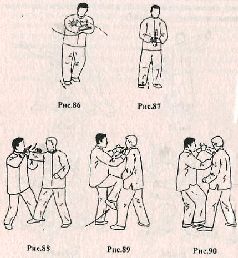 Центр тяжести сместите на левую ногу, а правой – сделайте небольшой шаг вперед, при этом обе руки скрестите перед грудью так, чтобы левая располагалась над правой, причём ладони должны быть направлены вверх. Сделайте вдох (рис. 86). Теперь поднимите правую ногу вверх, сгибая её в коленном суставе, и быстро опустите вниз, ударяя всей стопой о землю. Одновременно левую руку опустите вниз на уровень живота, а правую – поднимите немного вверх и сразу опустите вниз, сжав кисть в кулак и ударяя по раскрытой левой ладони. Движение выполняется на фазе выдоха (рис. 87). Применение. Техника атаки и зашиты аналогична форме №2 (рис. 88.89.90).