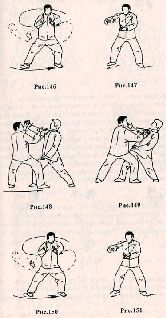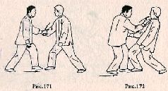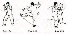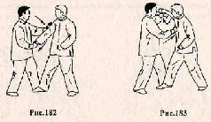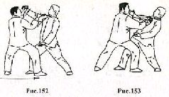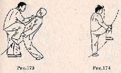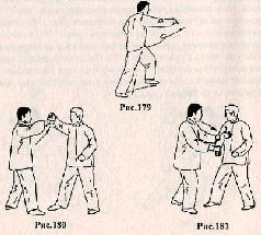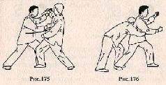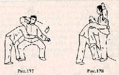 Применение. В случае поединка с двумя противниками, когда вы, отразив атаку одного из нападающих и контратаковав его прямым ударом правым кулаком в солнечное сплетение (рис. 175), оказались захваченными сзади другим противником (рис. 176), необходимо повернуться направо, принимая стойку «мабу» и нанести правым локтем удар назад в голову (рис. 177). После чего следует ещё немного повернуться направо, одновременно нанося восходящий удар правым коленом в солнечное сплетение и нисходящий удар правым локтём в область затылка (рис. 178).