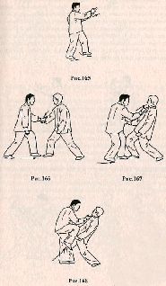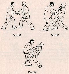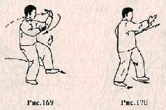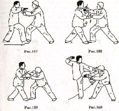 Применение, Противник делает шаг правой ногой вперёд и атакует, нанося прямой улар в грудь. Быстро слетайте шаг левой погон вперёд и наложите левую ладонь на правую руку противника, нейтрализуя его атаку (рис. 162). Теперь подшагните правой ногой к левой и нанесите тычковый удар пальцами правой руки в горло, при этом левой рукой необходимо тянуть