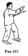 Опустите левую ногу на землю, делая шаг вперёд, и перенесите на неё вес тела. Одновременно вытяните правую руку вперёд и вверх, а левую руку отведите назад к пояснице. Сделайте выдох (рис. 161).
