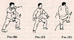 Корпус поверните направо, принимая стойку «мабу», при этом вес тела распределяется равномерно на обе ноги. Левую руку подведите к левому плечу, а правую – опустите вниз и расположите на уровне нижней части туловища. Сделайте вдох (рис. 184). Не меняя стойку, разведите обе руки в стороны, при этом правую руку опустите вниз. Сделайте выдох (рис. 185), Теперь центр тяжести сместите на левую ногу и повернитесь направо на 2700, поднимая согнутую в коленном суставе правую ногу вверх. Одновременно обе руки скрестите перед грудью. Движение выполняется на фазе вдоха (рис. 186).