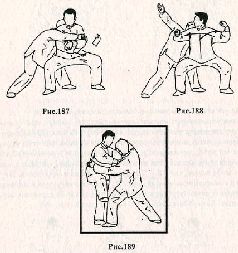 Применение. Если противник захватил вас за ногу обеими руками (рис. 226), сместите вес тела на другую ногу, и одновременно нанесите нисходящий удар левым кулаком в область затылка (рис. 227).