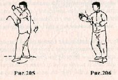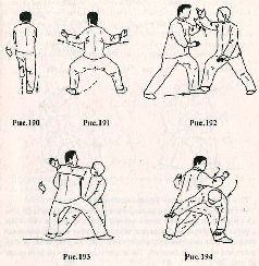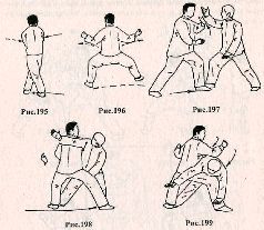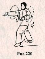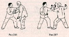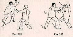 Применение. Если во время вашей атаки противник делает шаг назад с целью ухода из зоны поражения (рис.216,217), необходимо подпрыгнуть вверх, меняя положение ног (рис. 218), и, опустившись на землю, нанести рубящий удар ребром правой ладони в область шеи или по правому уху (рис. 219).