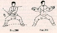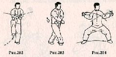 Центр тяжести сместите на левую ногу, а правой – сделайте шаг назад, при этом корпус поверните направо на 900. Правую руку согните в локтевом суставе и опустите вниз, подводя кулак к туловищу. Левую руку поднимите вверх на уровень лба. Сделайте вдох (рис. 205).