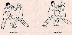 Применение. Если противник делает шаг левой ногой вперёд и атакует, нанося прямой удар левым кулаком в голову, быстро сделайте шаг левой ногой влево-вперёд, уходя с линии атаки, и нейтрализуйте удар, выставляя вперёд правое предплечье (рис. 207). Продолжая атаку, противник наносит ещё один удар, но уже правой рукой в грудь. Нейтрализуйте удар противника своей левой рукой, одновременно контратакуя правым кулаком в нижнюю челюсть (рис, 208).