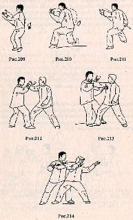 Применение. Противник делает шаг правой ногой вперёд и атакует, нанося прямой удар правым кулаком в голову. Нейтрализуйте атаку, выполняя блок предплечьем правой руки изнутри наружу (рис. 212). Быстро сделайте шаг левой ногой вперёд, ставя её за правой ногой противника. Одновременно левую руку подведите к правой подмышке противника (рис. 213). Принимая стойку «гунбу», нанесите левой рукой удар в грудь, при этом необходимо продолжать контролировать правую руку противника своей левой рукой (рис. 214).