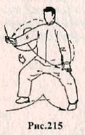 Центр тяжести сместите на правую ногу, а левую – поднимите вверх, согнув в коленном суставе. Одновременно правую руку поднимите вверх над головой, а левую – опустите вниз. Поворачиваясь налево, опустите левую ногу на землю, а правой ногой сделайте шаг вперёд. При этом правую руку опустите вниз на уровень груди. Левую руку подведите к левому бедру, располагая кисть над коленом. Движение выполняется сначала на фазе вдоха, а затем выдоха (рис. 215).