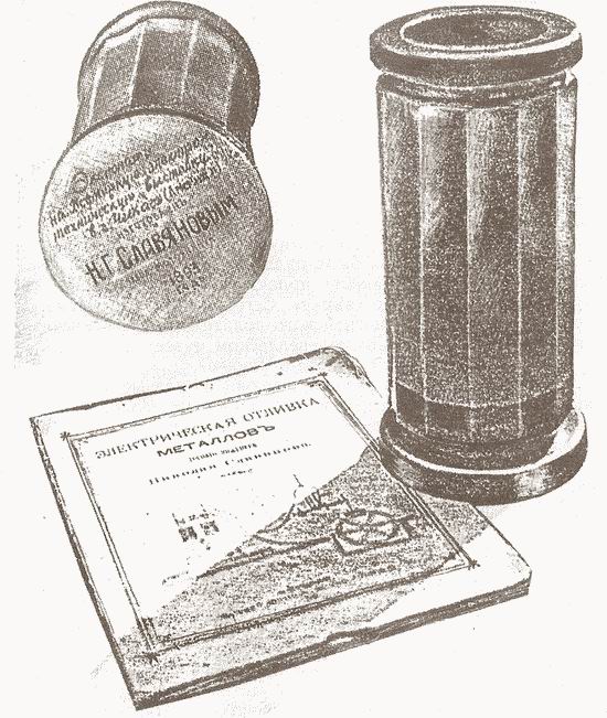 «Электрогефест», или «способ соединения и разъединения металлов непосредственным действием электрического тока». помогал сплавлять друг с другом железные листы. Для этого изобретатель .присоединял их к одному полюсу динамо-машины, а провод от другого полюса отводил к угольному электроду. Когда прикасались углем к стыку листов, между металлом и углем загоралась электрическая дуга. В пламя дуги вводили металлический стержень. В жаре дуги кромки стыка сплавлялись, а стержень, тая, как свеча, заваривал шов.